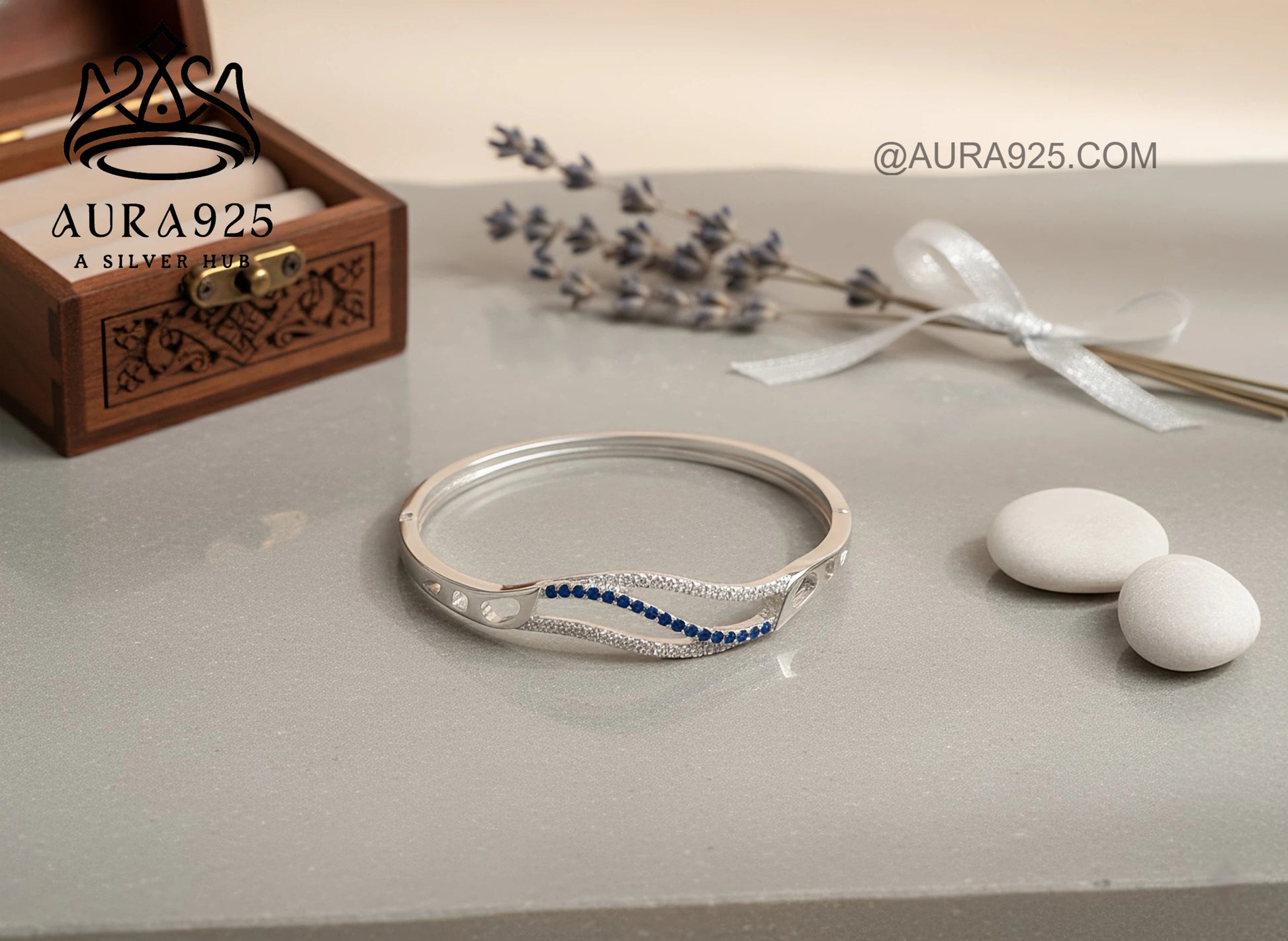 Make a statement with the Elegant Wave Silver Bracelet from AURA925. This beautiful ladies' bracelet features a sleek, curved design that flows gracefully around the wrist. The centerpiece showcases a captivating contrast: one wave is lined with brilliant clear Cubic Zirconia (CZ) stones, while the parallel wave shimmers with deep, sapphire-colored blue CZ stones.