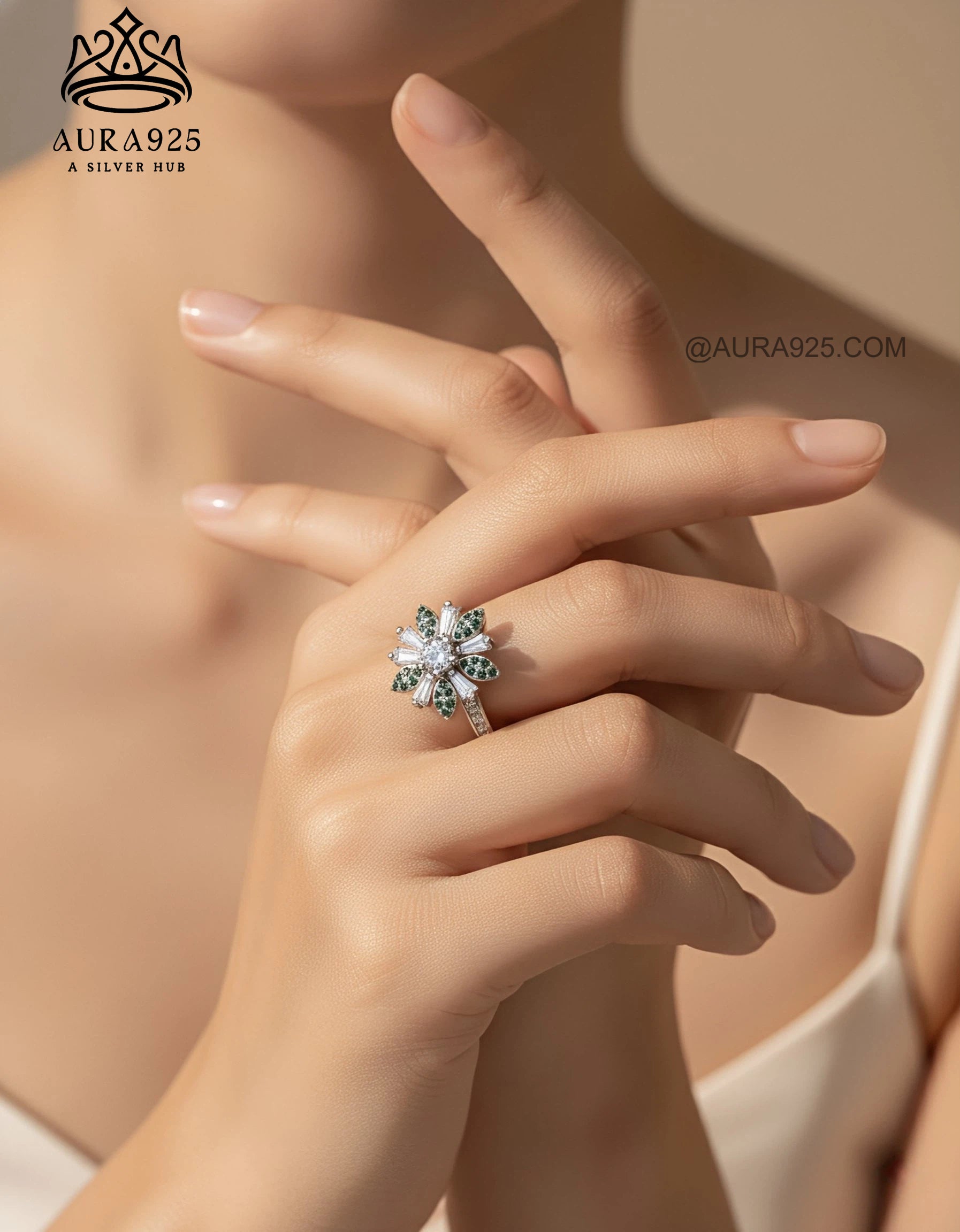 🌸 Sparkling Flower Cluster Ring: Green & White Zirconia
