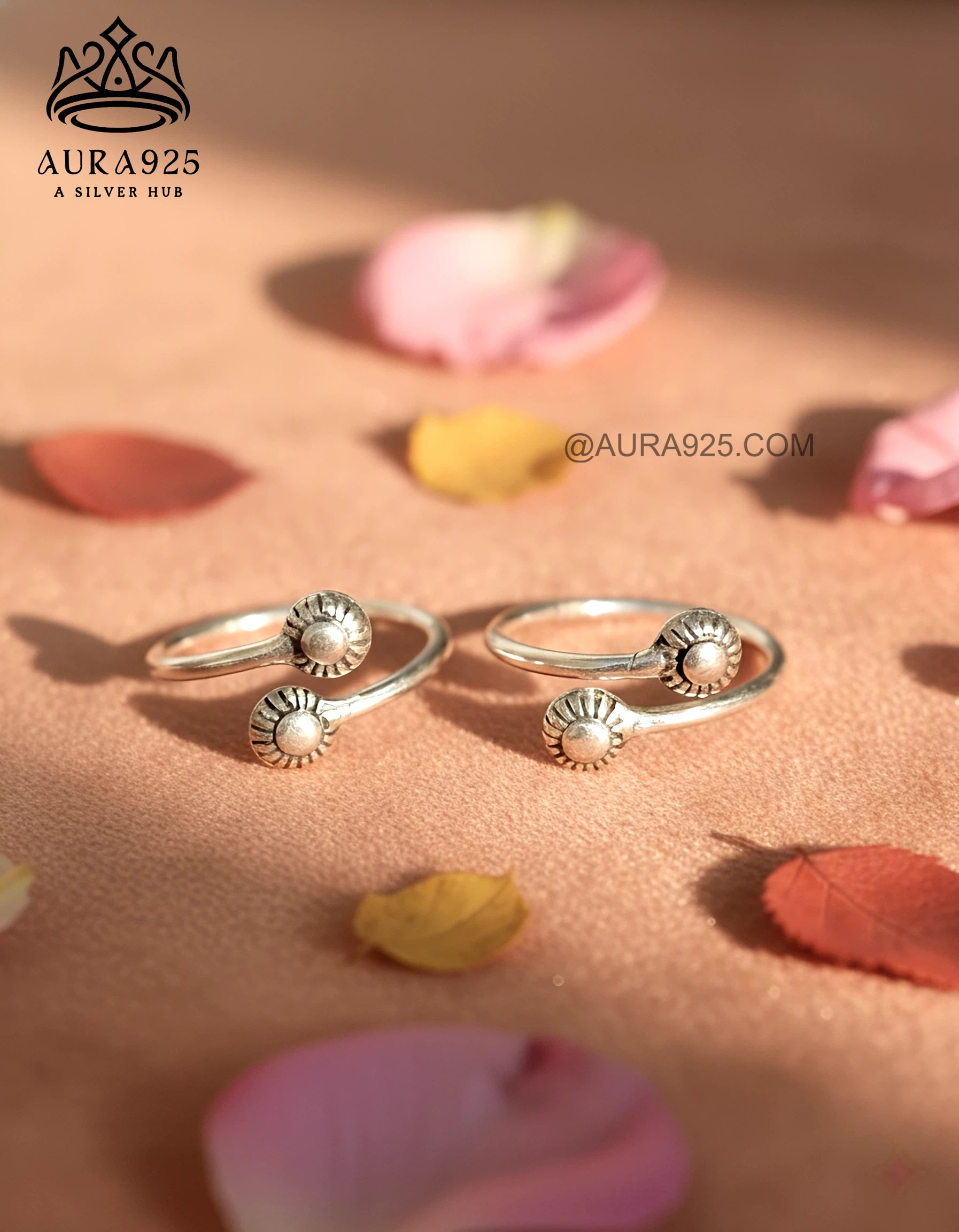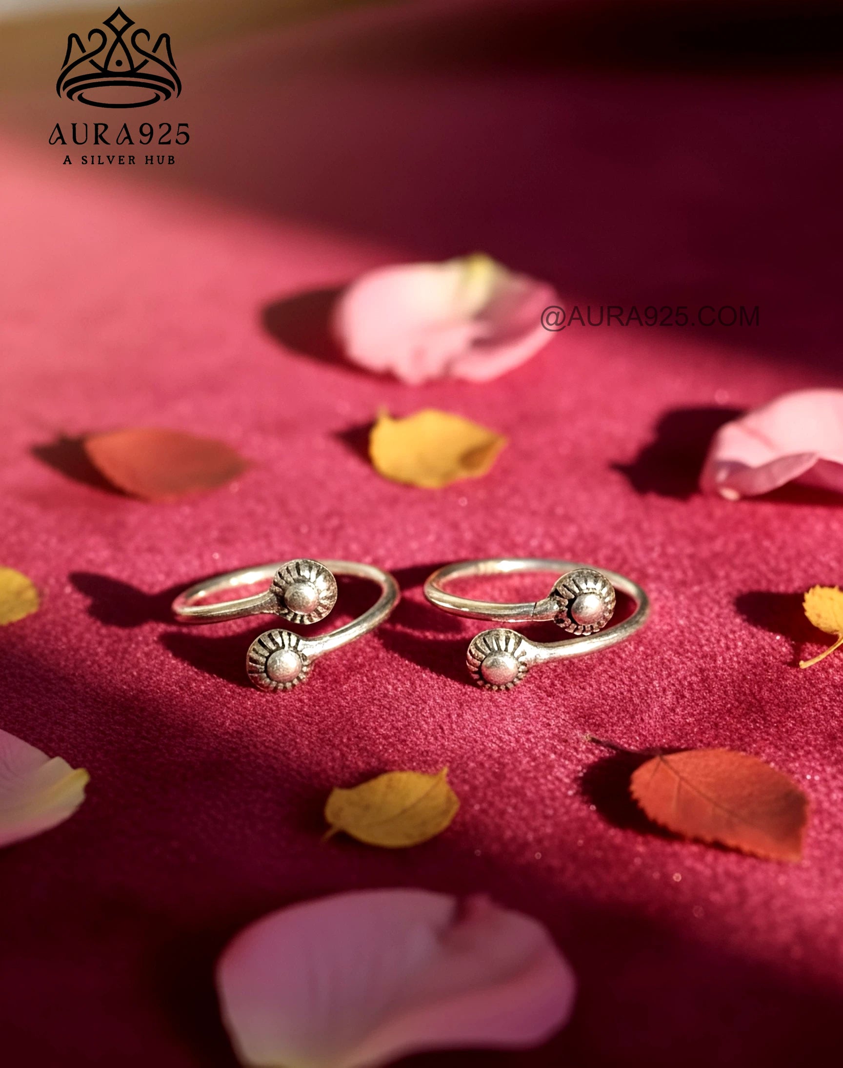 Adorn your feet with the timeless charm of our Silver 925 Dual Sunburst Toe Rings. This striking pair features two intricately detailed spherical motifs (often referred to as 'ghungroo' or bead-work style), framed by a radiating sunburst pattern. The rings are finished with a classic oxidized polish, enhancing the texture and providing a rich, antique look.