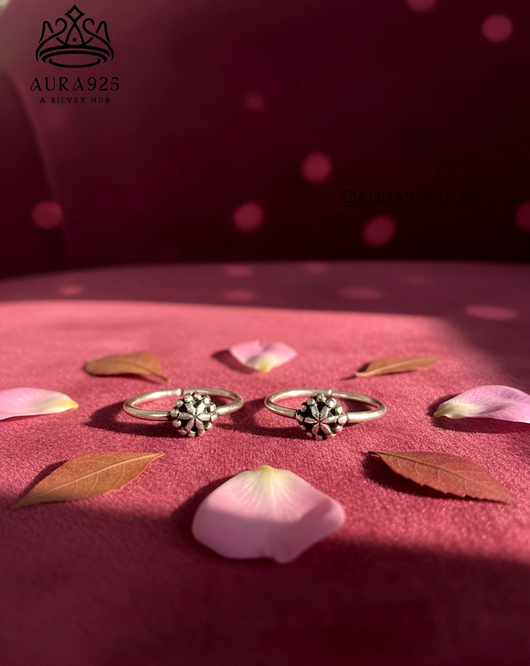 Introduce the artistry of traditional silverwork to your feet with our stunning Silver 925 Mandala Flower Toe Rings. This striking pair showcases a captivating, domed floral or starburst motif, intricately detailed with petals and a central bead. The rings are treated with a rich oxidized finish, giving them a desirable antique look that beautifully highlights every tiny curve and texture.